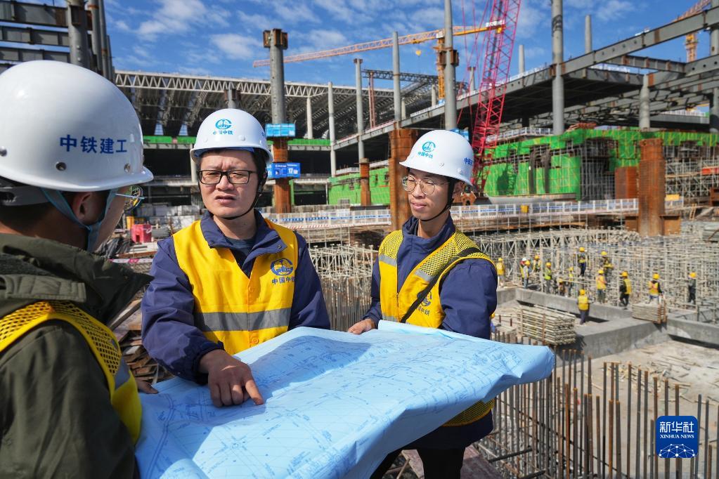 1月21日,中鐵建工廣州白云火車站項目總工程師劉?。ㄖ校z查工程進度。