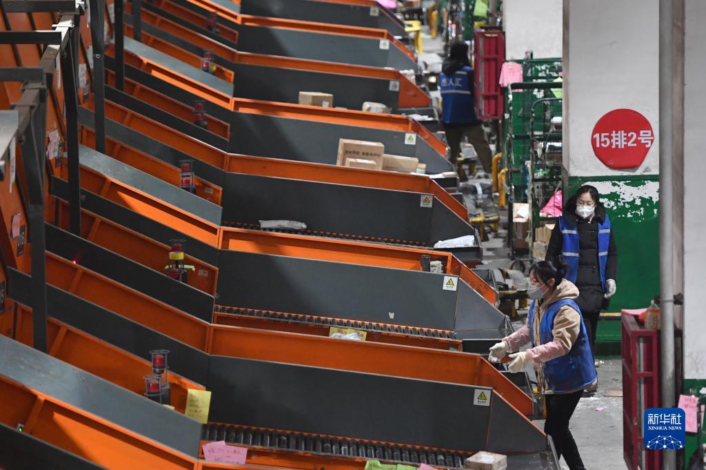 1月21日,在中國郵政速遞物流鄭州郵件處理中心,工作人員在進行分揀作業。
