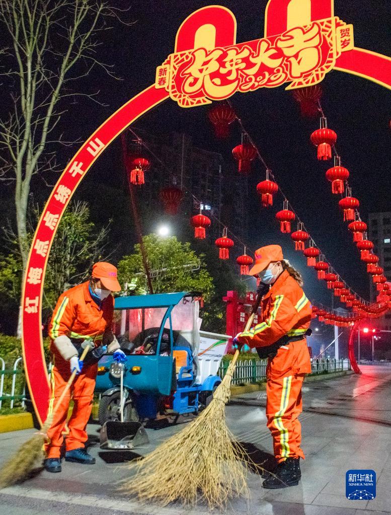 1月21日,在安徽省蕪湖市繁昌區繁陽鎮渡江大道上,環衛工人在進行保潔作業。