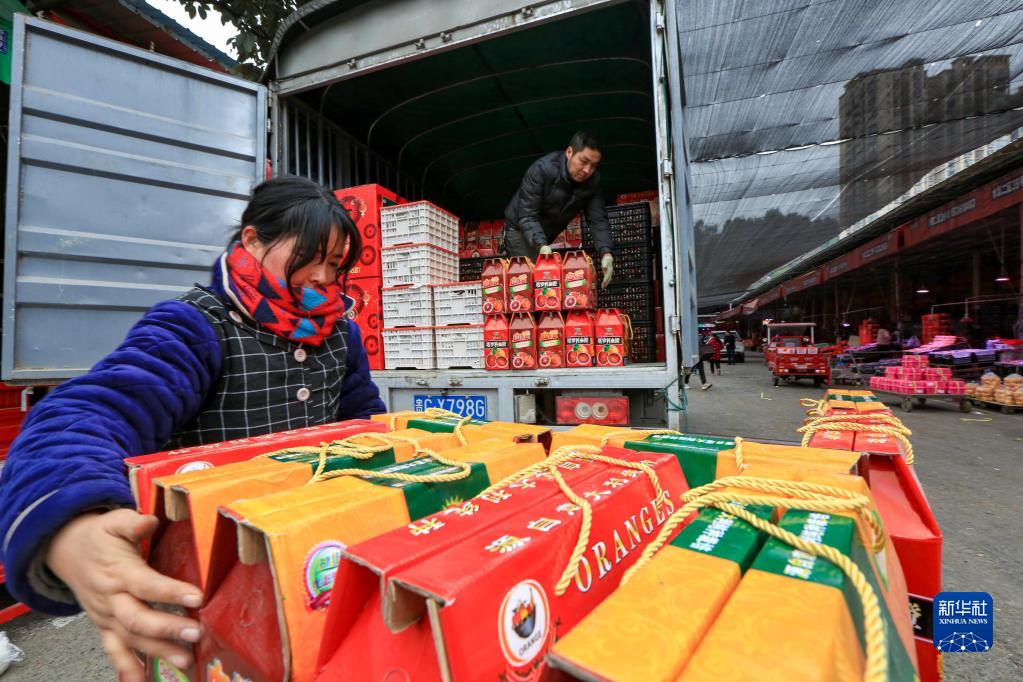 1月21日,工人在貴州省遵義市播州區龍坑街道農產品批發市場里搬運新鮮水果。