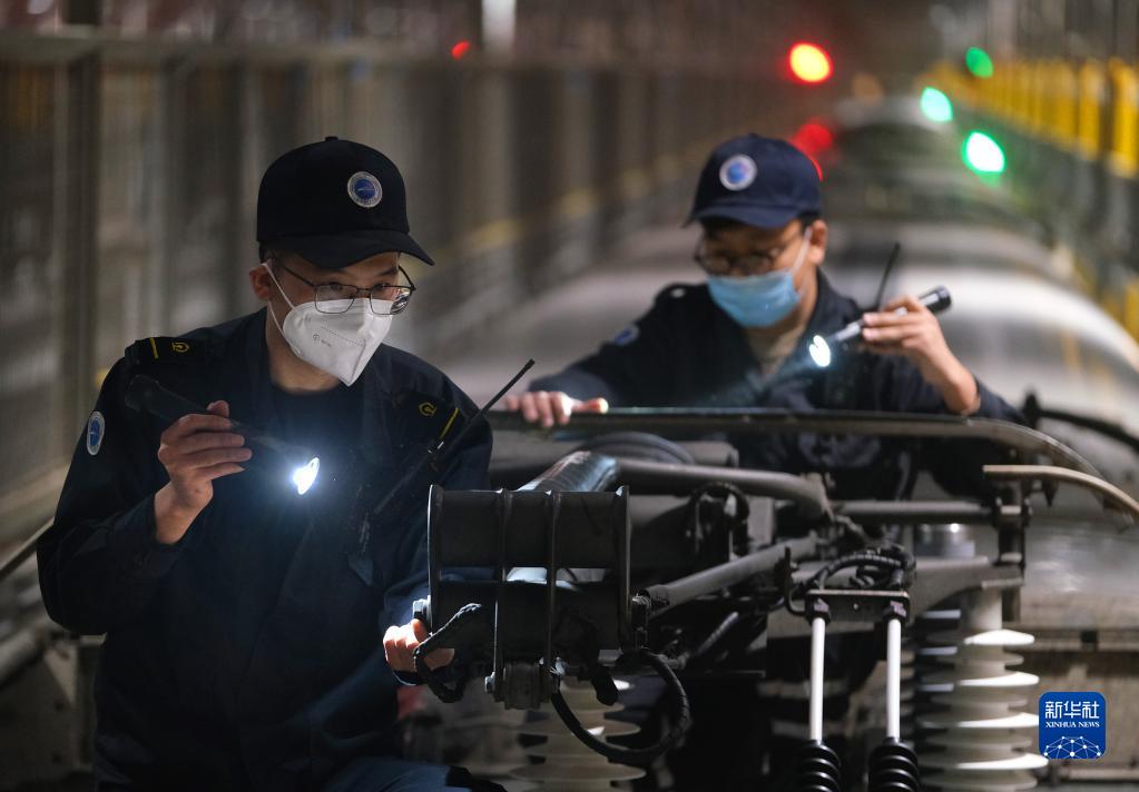 1月21日凌晨,機械師在天津動車客車段動車運用所檢修庫對進庫的動車組列車高壓供電系統設備進行檢修。