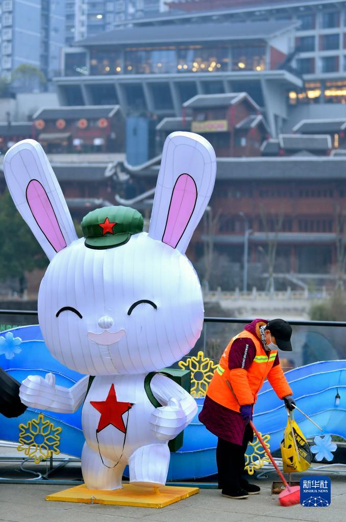 1月21日,環衛工人在湖北恩施土家族苗族自治州宣恩縣城興隆老街進行清掃保潔作業。