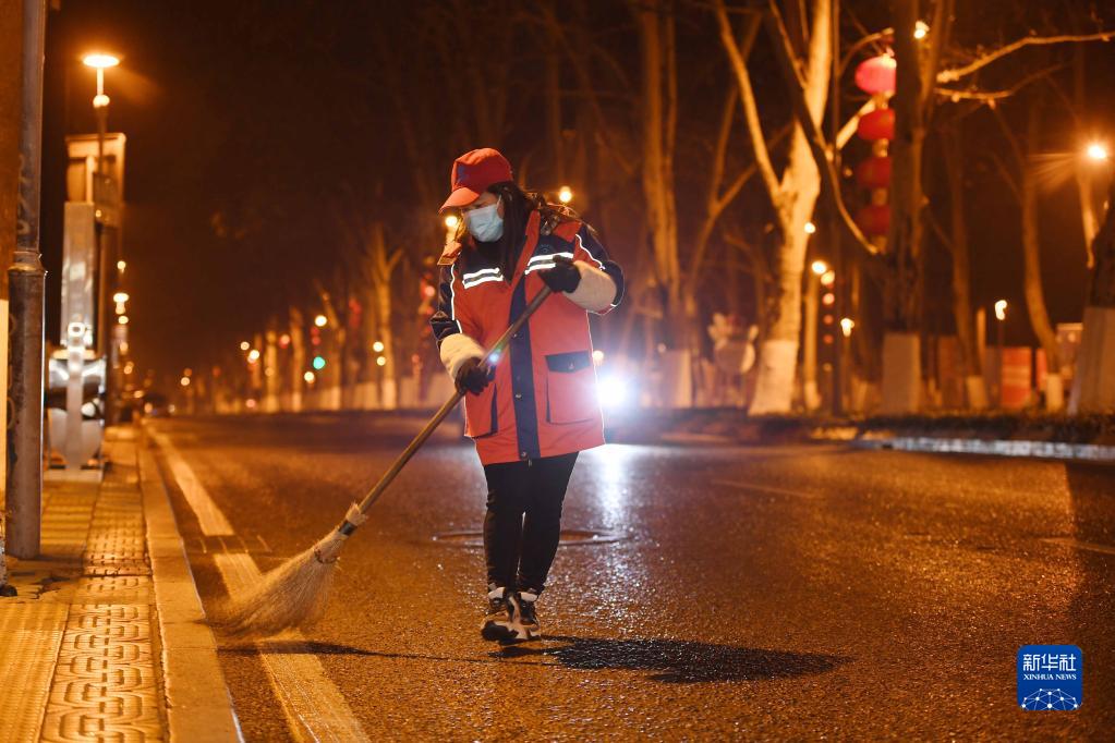1月21日,環衛工人阮志萍在貴州省貴陽市云巖區寶山北路清掃街道。