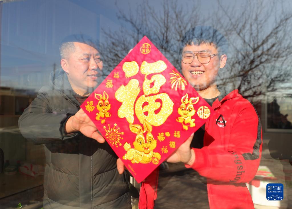 1月20日,沈陽工學院老師和李天騏(右)一起貼福字。