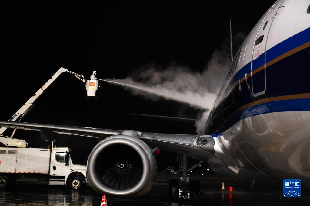 1月17日晚,在貴州貴陽龍洞堡國際機場,南方航空的機務人員進行除防冰作業,為保障春運航班安全進出港默默堅守。