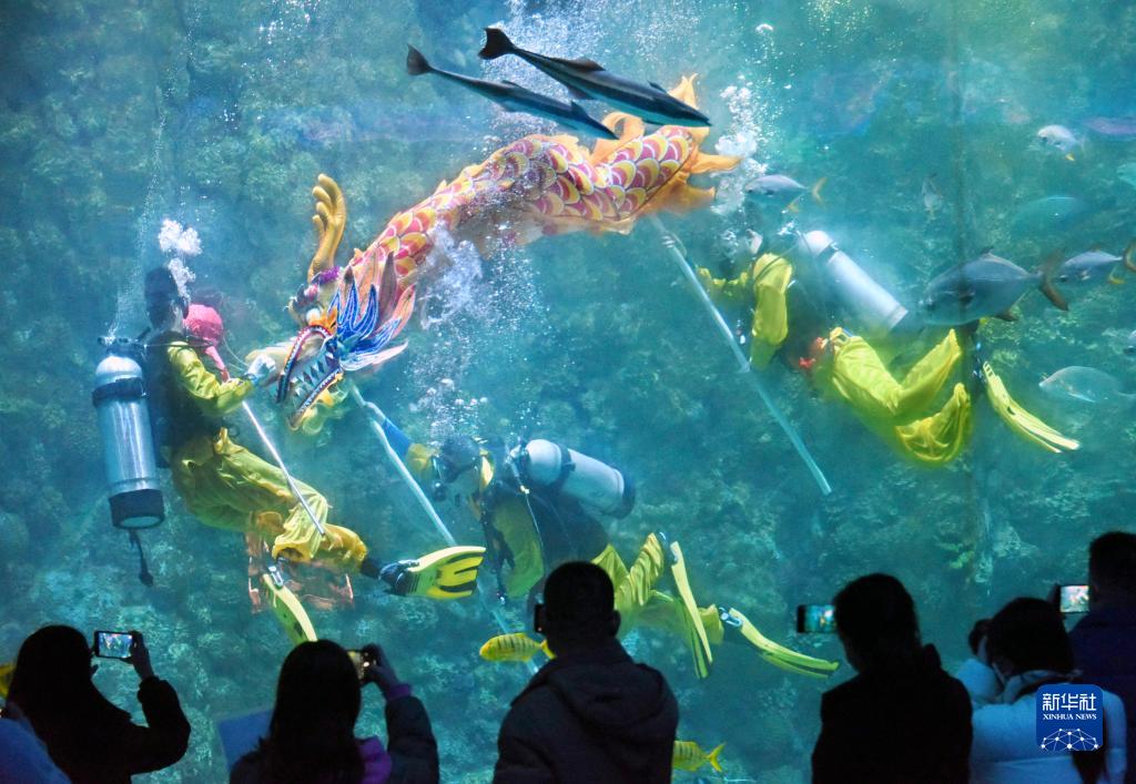1月18日,游客在山東青島極地海洋公園觀看“海底舞龍”表演。