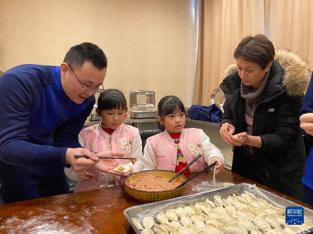 1月21日,在黑龍江漠河北極村消防救援站內,來自湖北武漢的游客與消防員一起包餃子。北極村消防救援站的消防員在執勤過程中,通過與這些游客交流得知他們要在北極村過年,便邀請他們來北極村消防站一起迎接兔年春節。