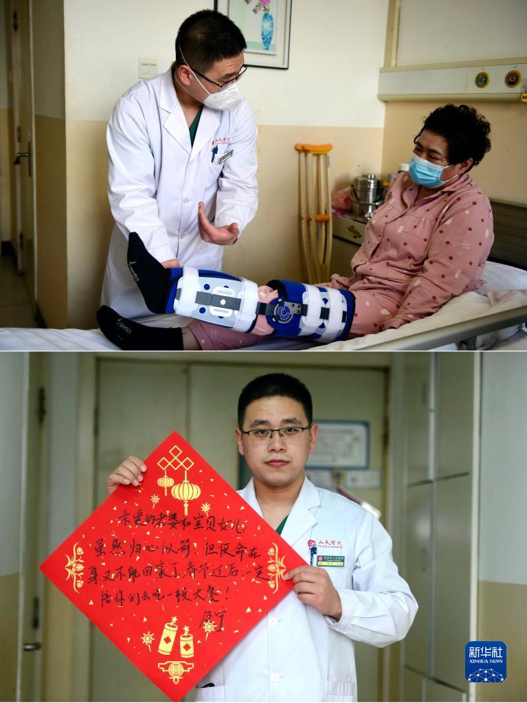 拼版照片:1月21日,滄州市人民醫院骨四科醫生及寧為患者查體(上圖);及寧寫的“致歉語”:“親愛的老婆和寶貝女兒:雖然歸心似箭,但使命在身又不能回家了,春節過后一定陪你們吃頓大餐”(下圖)。