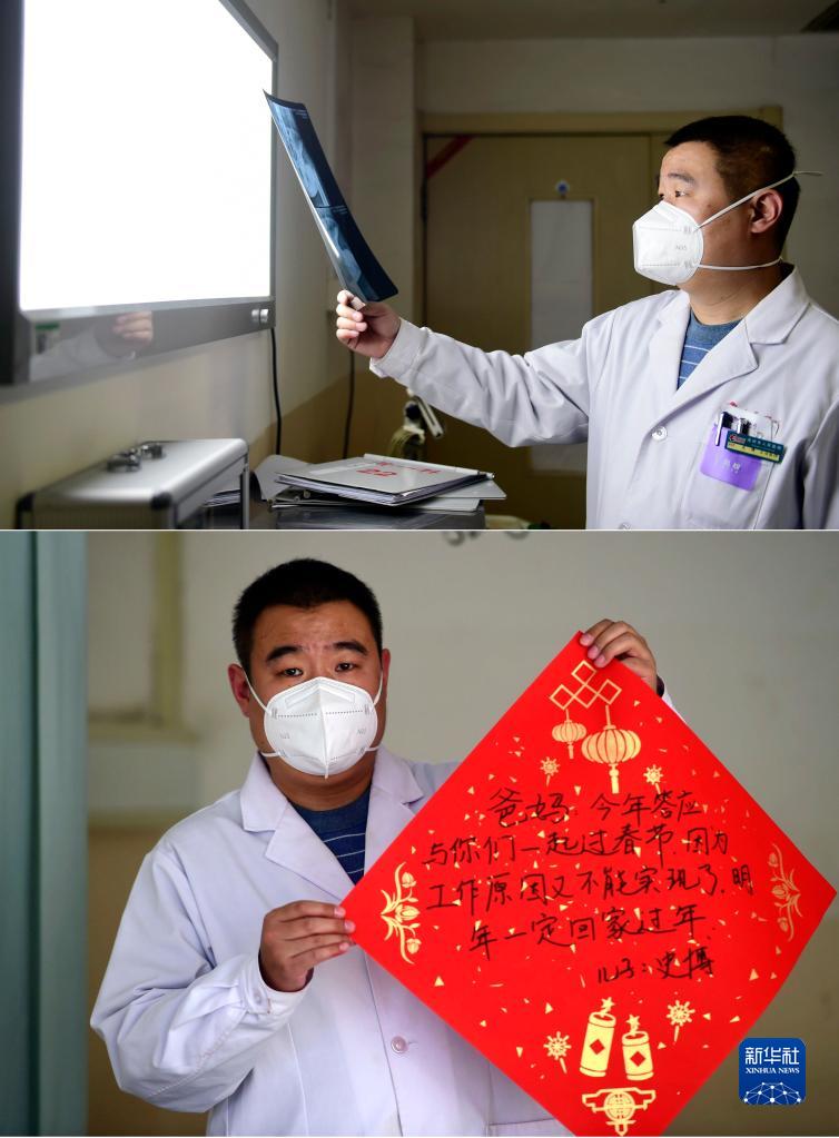 拼版照片:1月21日,滄州市人民醫院創傷脊柱骨科醫生史博在查看患者影像(上圖);史博寫的“致歉語”:“爸媽:今年答應與你們一起過春節,因為工作原因又不能實現了,明年一定回家過年”(下圖)。