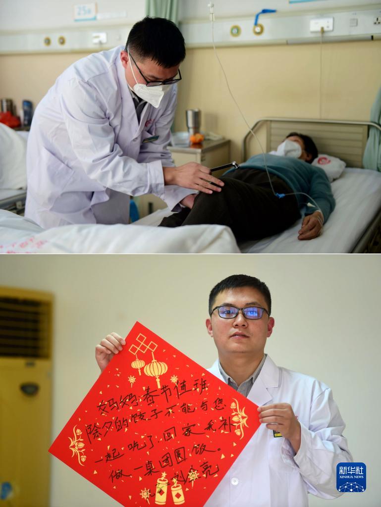 拼版照片:1月21日,滄州市人民醫院神經內七科醫生劉全亮在病房為患者做檢查(上圖);劉全亮寫的“致歉語”:“媽媽:春節值班,除夕的餃子不能與您一起吃了,回家我補做一桌團圓飯”(下圖)。