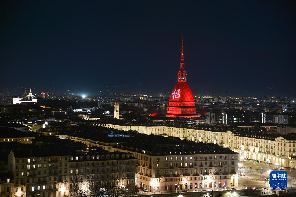 1月21日晚,意大利都靈的地標性建筑安托內利尖塔點亮“中國紅”和“?!?字,慶祝中國春節。