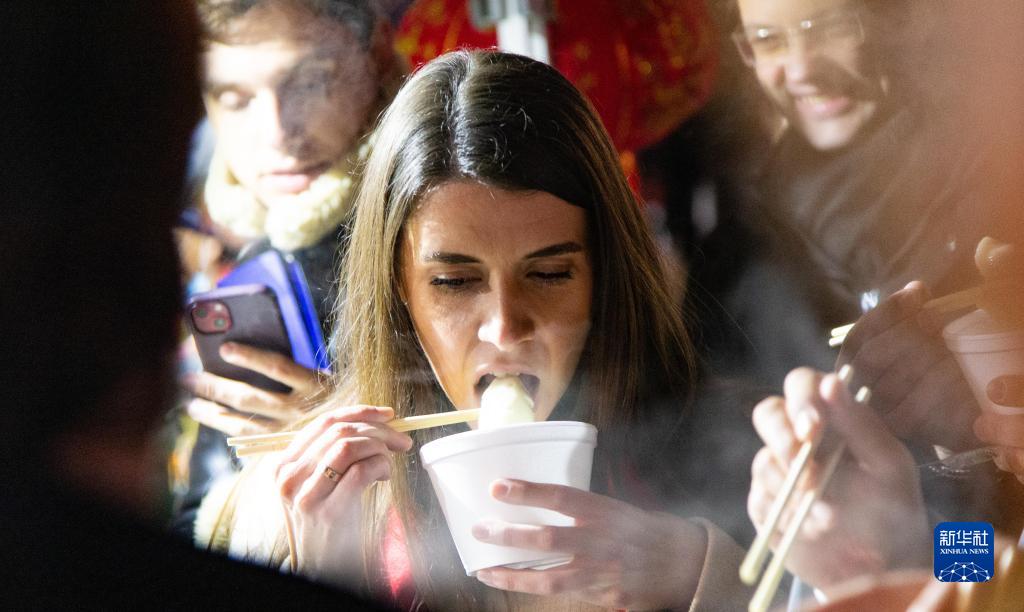 1月21日晚,在塞爾維亞首都貝爾格萊德舉行的“歡樂春節——絲綢之路上的友誼大篷車”活動上,一名塞爾維亞女子品嘗餃子。