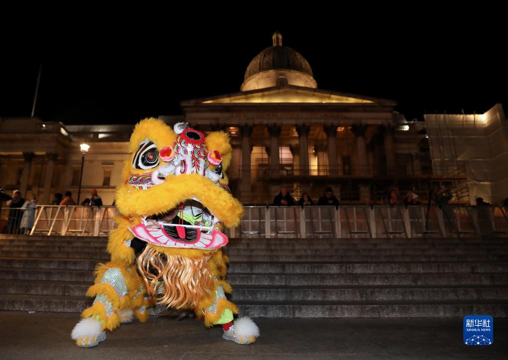 1月21日晚,演員在英國倫敦特拉法加廣場表演舞獅。