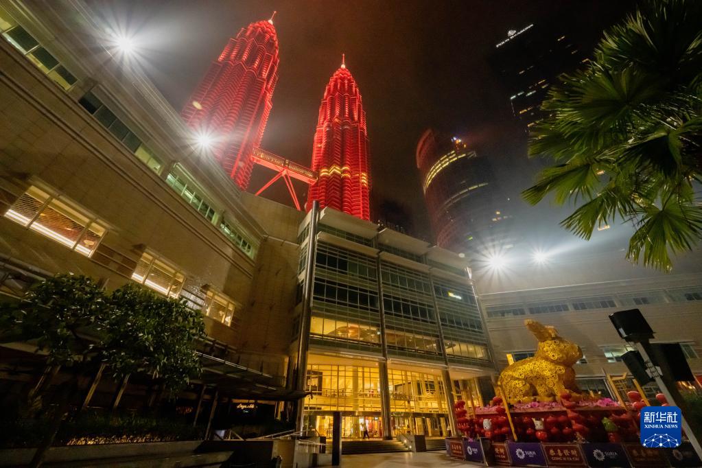 1月22日零時許,位于吉隆坡的馬來西亞國家石油公司雙塔點亮紅色燈光,慶祝農歷新年的到來。