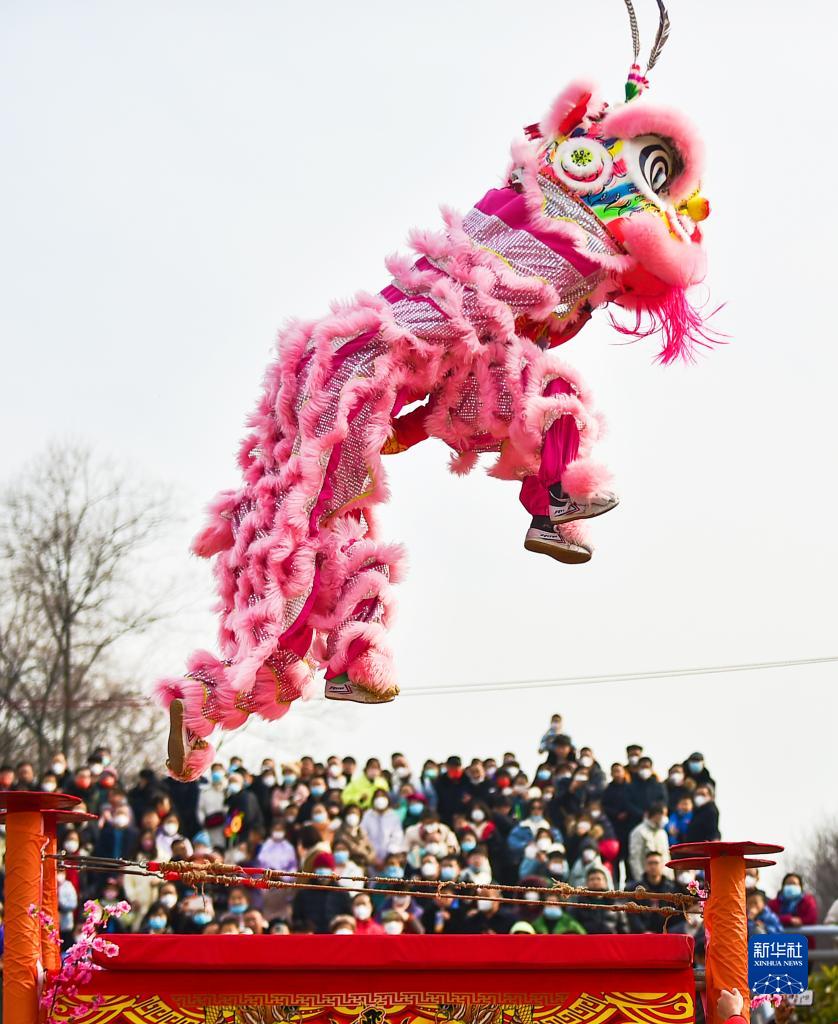 1月22日,在河南洛陽一文化廟會上,游客欣賞舞獅表演。