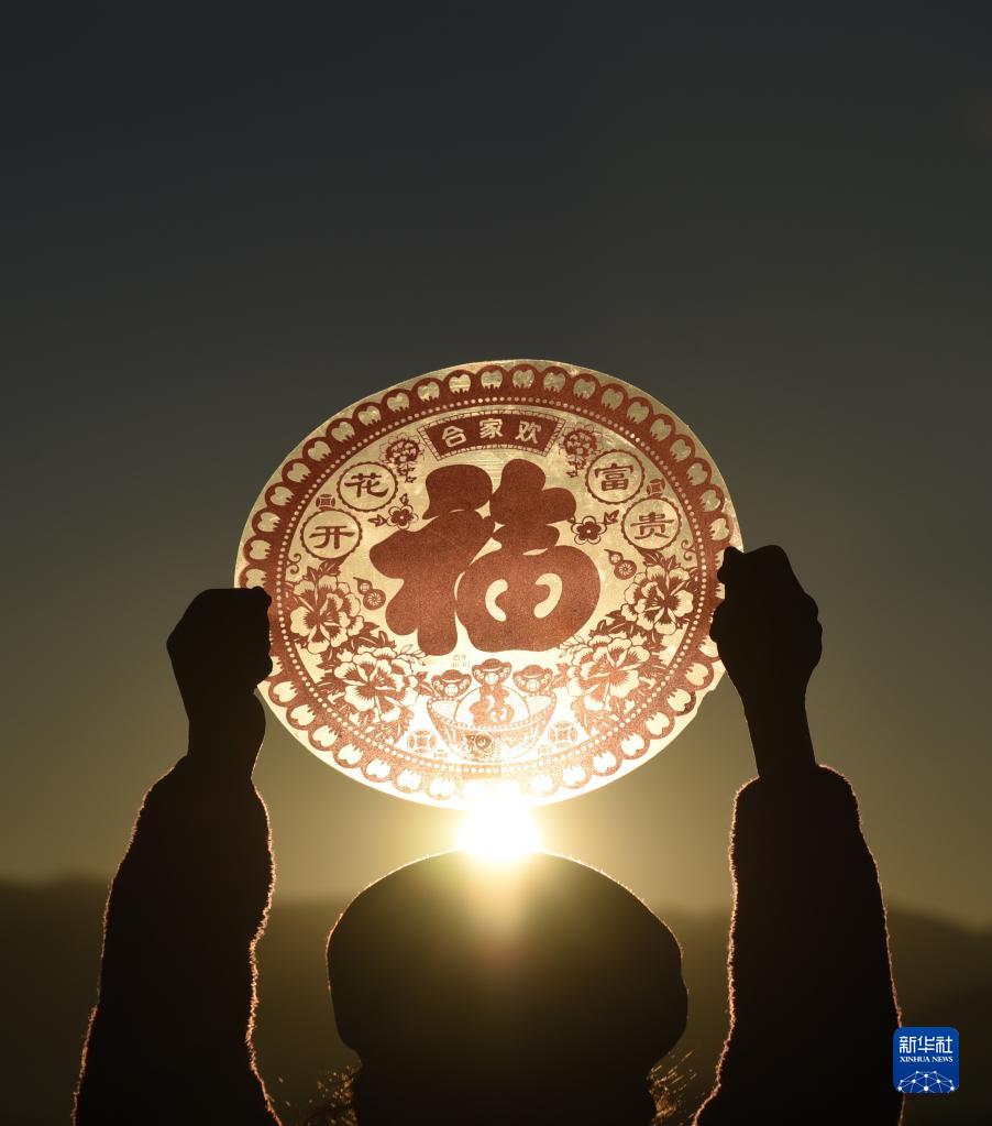 1月22日,在云南省大理州劍川縣馬登鎮文屏村,村民舉起福字,迎接新年第一縷陽光,寓意“福迎新春”。