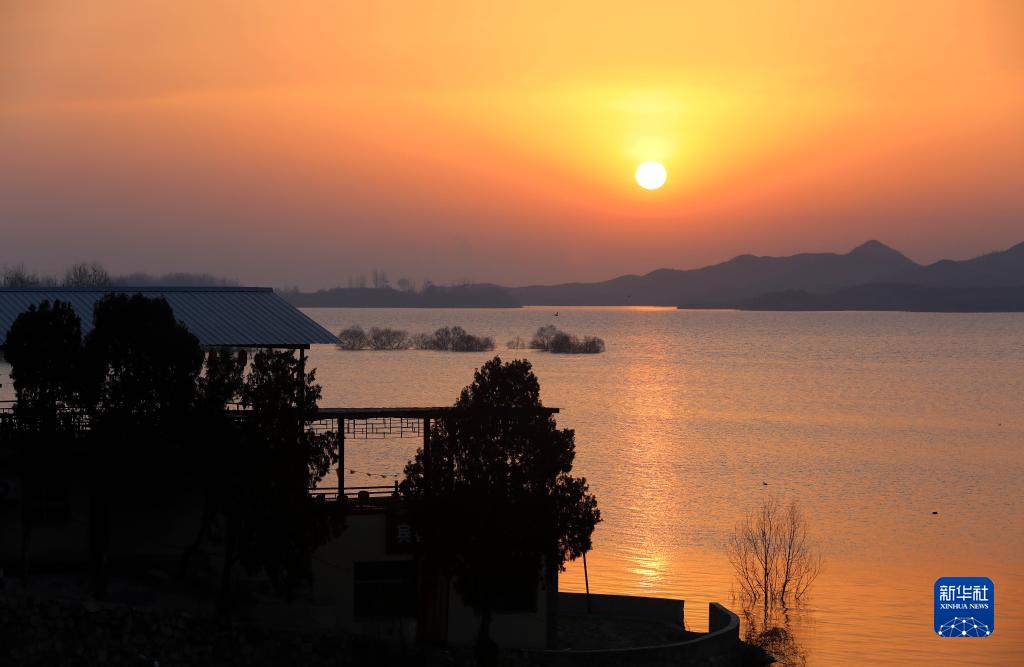 1月22日在河北省平山縣西柏坡崗南水庫拍攝的日出。