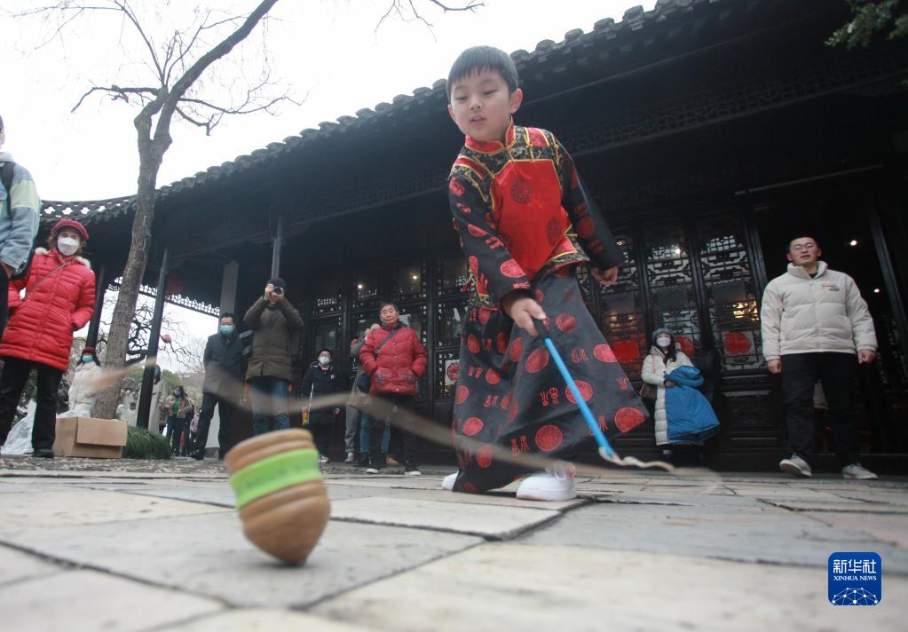 1月22日,在江蘇省揚州市何園景區,小朋友在玩“打陀螺”游戲。