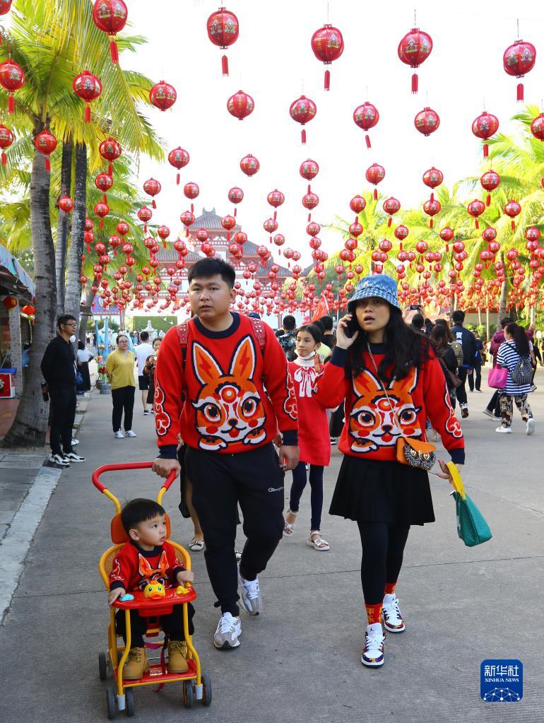 1月22日,家長帶著孩子在海南省三亞市南山文化旅游區游覽。