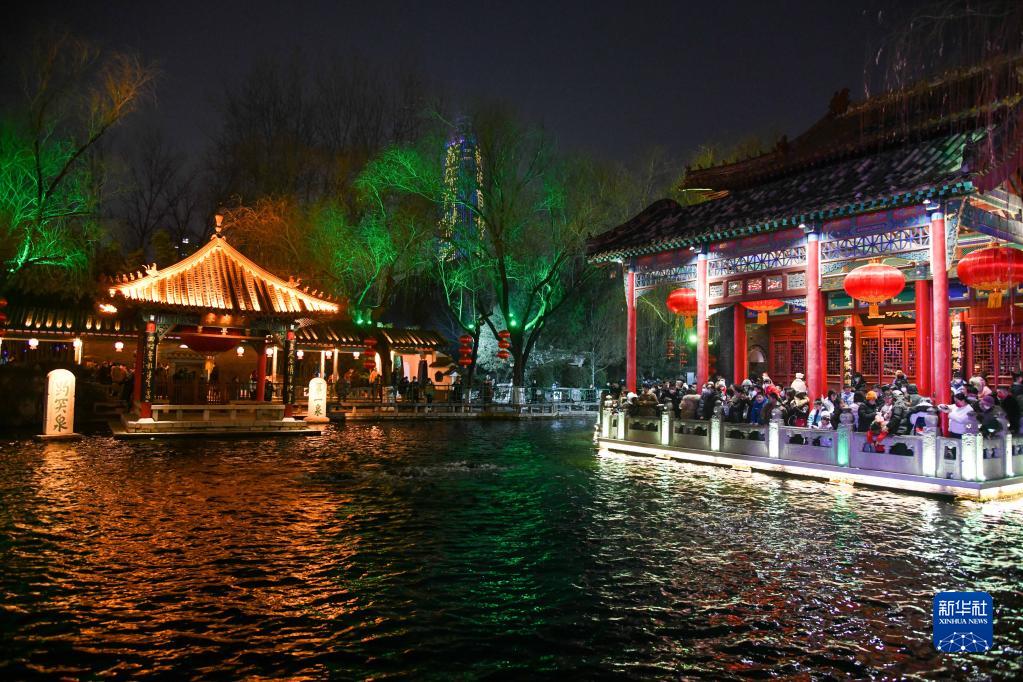 1月22日,游人在濟南趵突泉公園內參觀噴涌的趵突泉水。