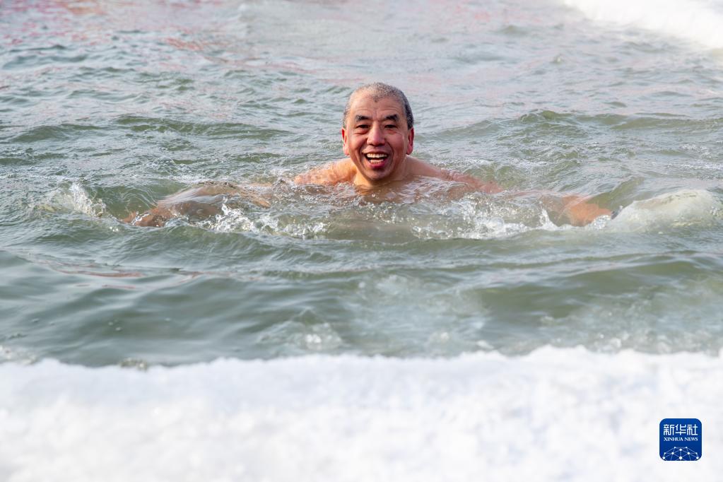 1月22日,在黑龍江省哈爾濱市,冬泳愛好者在松花江中暢游。