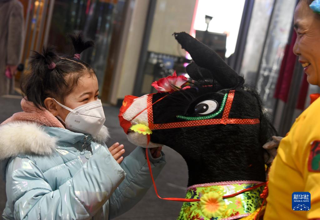 1月22日,在位于新疆烏魯木齊的天山萬科廣場內,小朋友與民間社火團隊演員互動。