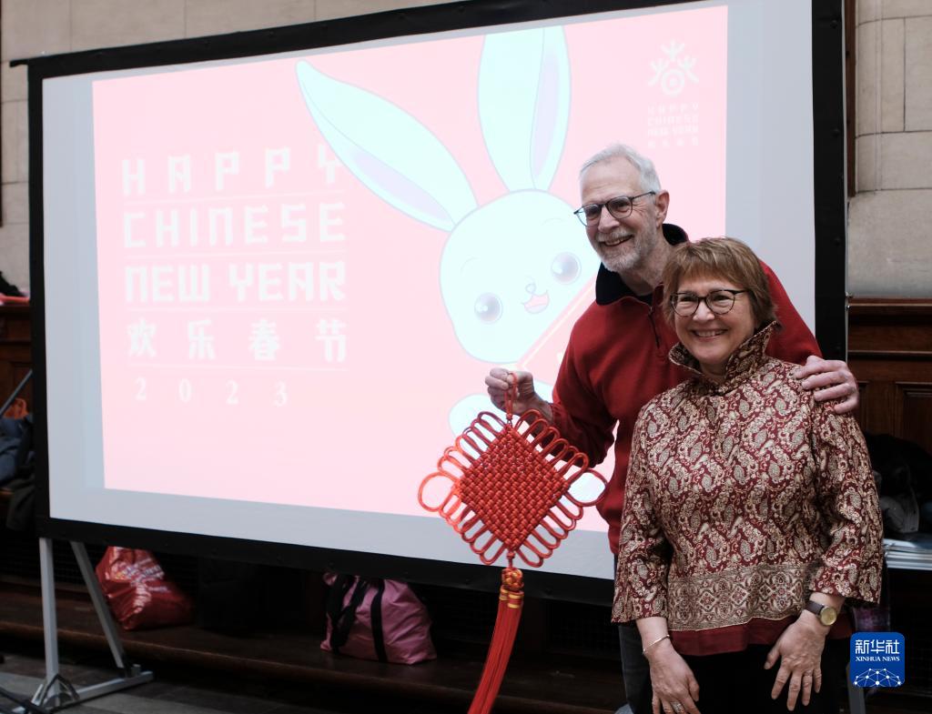 1月21日,人們在丹麥哥本哈根中國文化中心主辦的“歡樂春節嘉年華”活動上與中國兔年影像合影留念。
