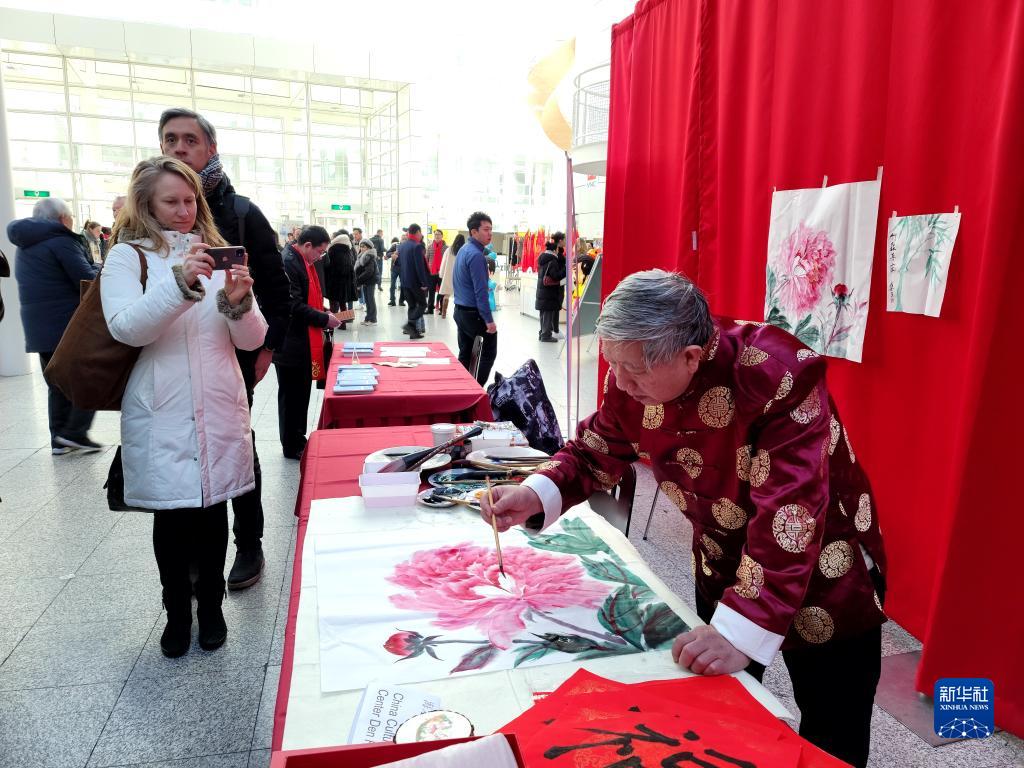 1月21日,一名藝術家在荷蘭海牙市政廳作畫。當日,海牙市政廳內張燈結彩,舉辦中國新年慶?;顒?。