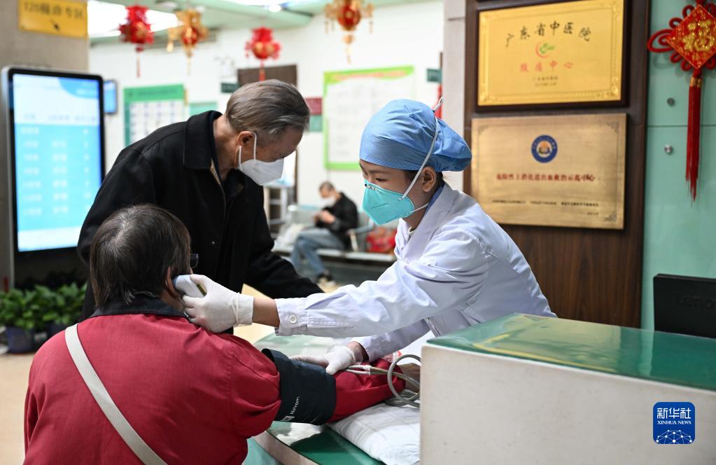 1月21日除夕夜,廣東省中醫院大德路總院急診科的醫護人員在分診臺為患者測量體溫。