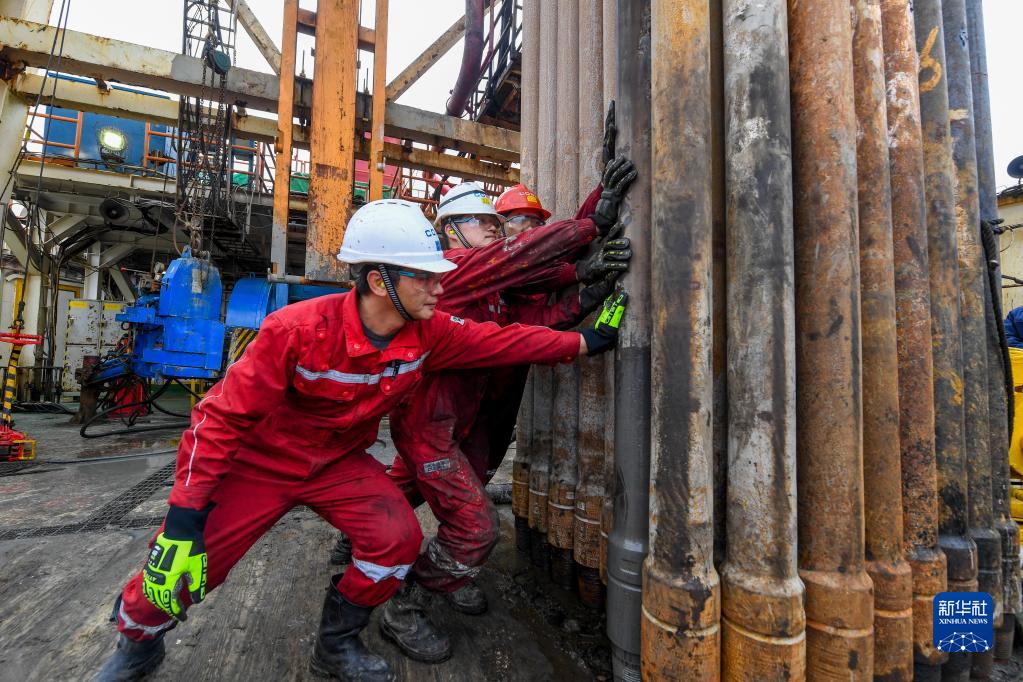 1月20日,石油工作者在鉆井平臺鉆臺區擺放鉆桿。
