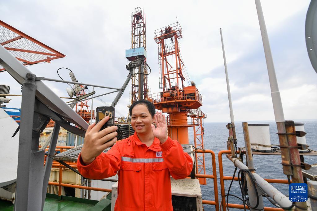 1月20日,李錫鴻在鉆井平臺生活區與妻子打視頻電話。南海東部油田由于離岸較遠,曾經長期無法收到手機信號。隨著我國海上平臺通信網絡基礎設施建設全面鋪開,遠離陸地的“石油人”能夠經常通過手機與家人朋友聯絡。