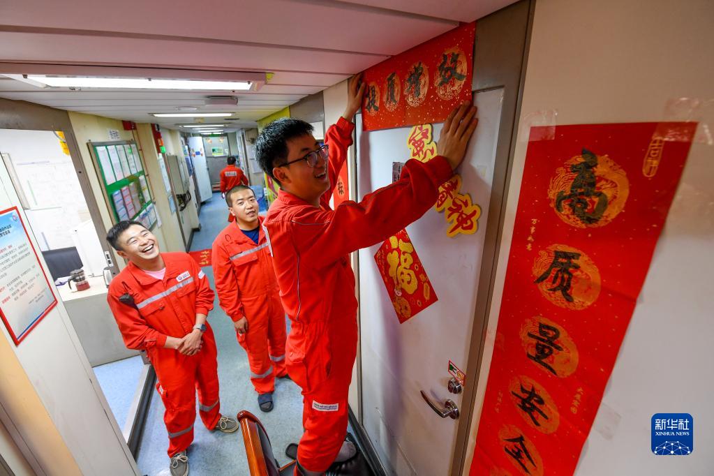 1月20日,工作人員在鉆井平臺的生活區張貼春聯。
