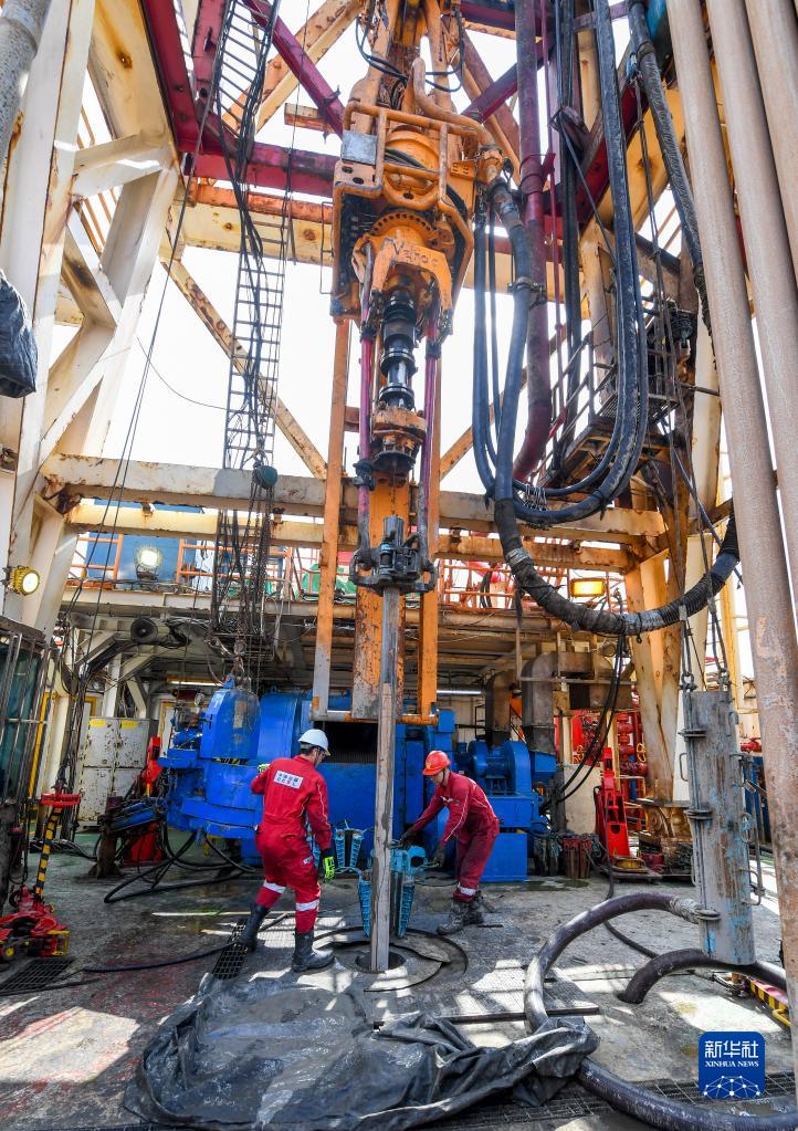 1月20日,石油工作者在鉆井平臺鉆臺區作業。