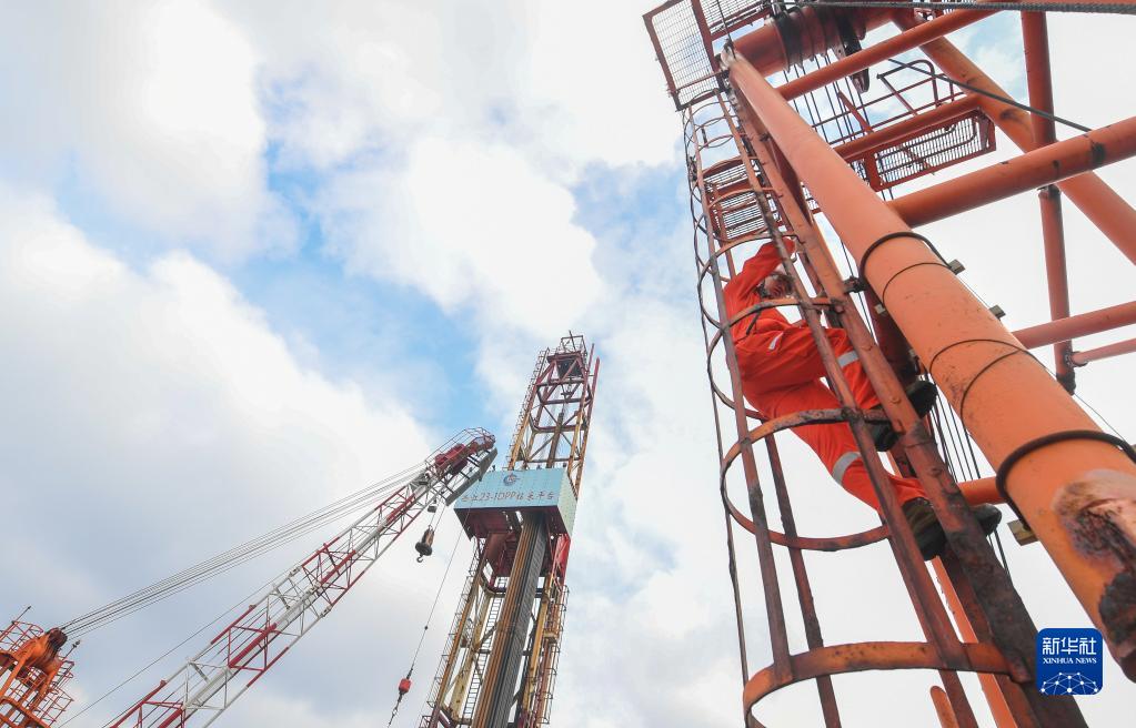 1月20日,在西江23-1平臺,一名石油工作者在攀爬塔吊。