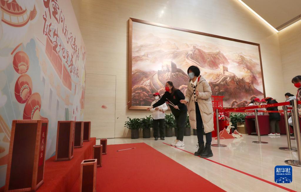 1月22日,參觀者在上海中共一大紀念館內體驗結合黨史知識問答的傳統投壺游戲。