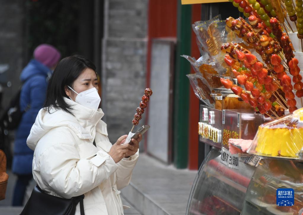 1月22日,在北京煙袋斜街的一家店鋪,游人購買糖葫蘆。