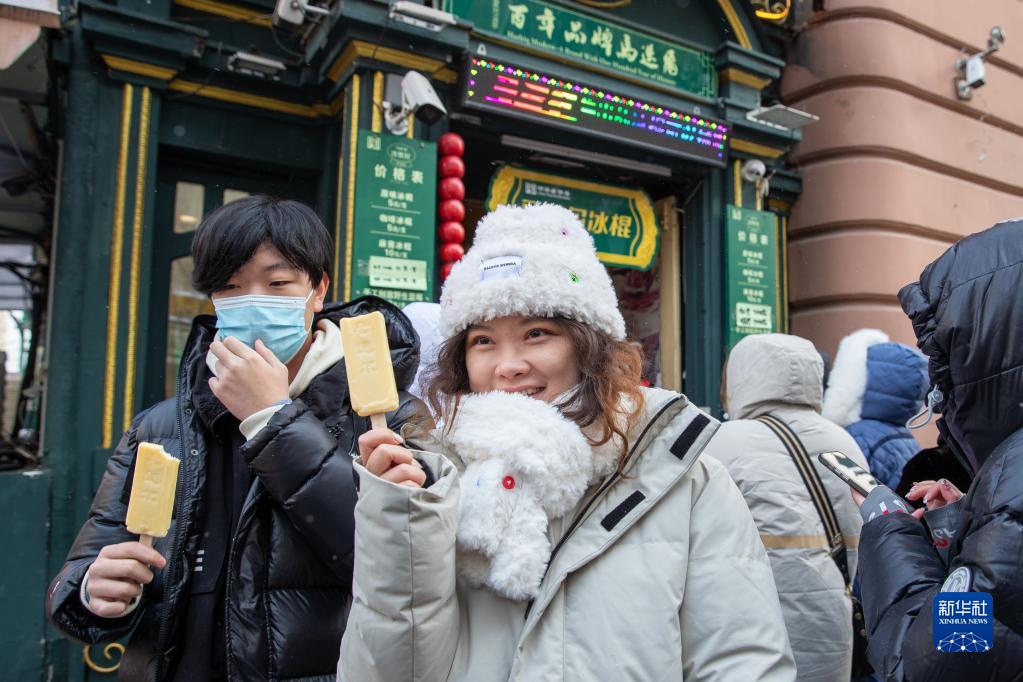 1月22日,在哈爾濱道里區中央大街上,游客拿著冰棍拍照留念。