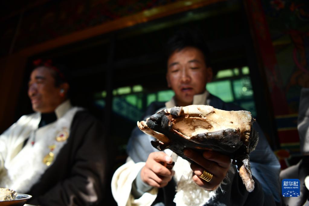 次旦老人孫子在吃過年必吃的傳統特色美食羊頭(1月22日攝)。