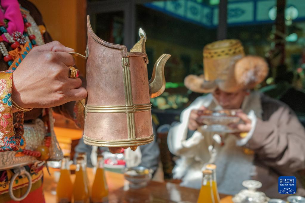 次旦老人的孫女給家人敬上青稞酒(1月22日攝)。
