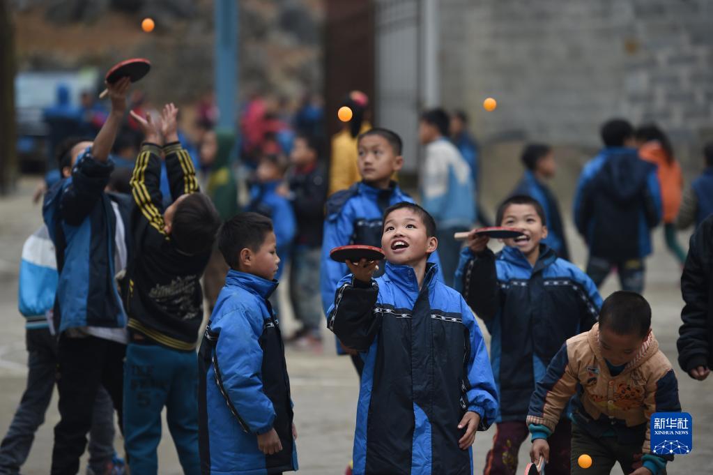 在弄勇小學讀四年級的蒙宣汰(中)在操場上玩乒乓球(2015年1月6日攝)。