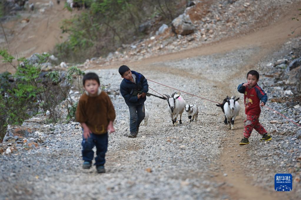 在弄勇小學讀四年級的蒙宣汰(中)利用周末幫父母放羊(2015年3月7日攝)。