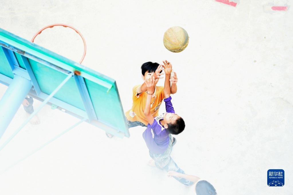 在弄勇小學讀六年級的蒙宣任(左)在打籃球(2015年5月7日攝)。