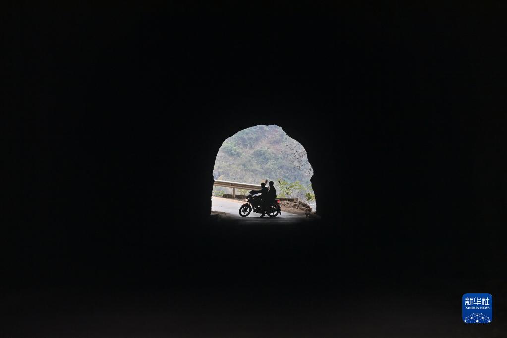 蒙宣任(左)和蒙宣汰騎摩托車經過懸梯下方的隧道(2023年1月20日攝)。2014年,隧道打通、公路修通后,“天梯上學路”成為歷史。