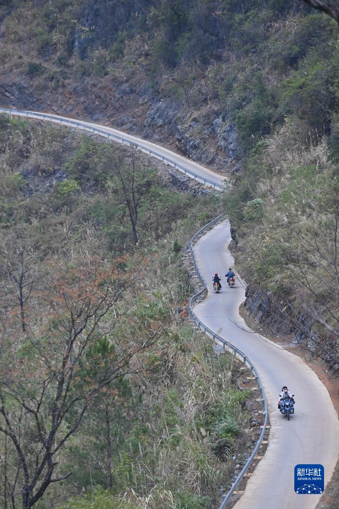 蒙宣汰(上右)和朋友騎摩托車回家(2023年1月20日攝)。曾經上學必經的山路,在2016年修通了水泥路。
