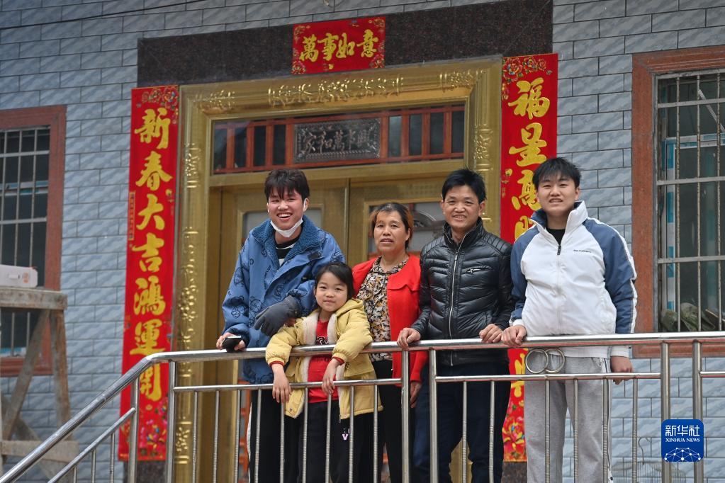 蒙宣任(右一)、蒙宣汰(左一)和爸爸、媽媽、妹妹在家門口合影(2023年1月21日攝)。