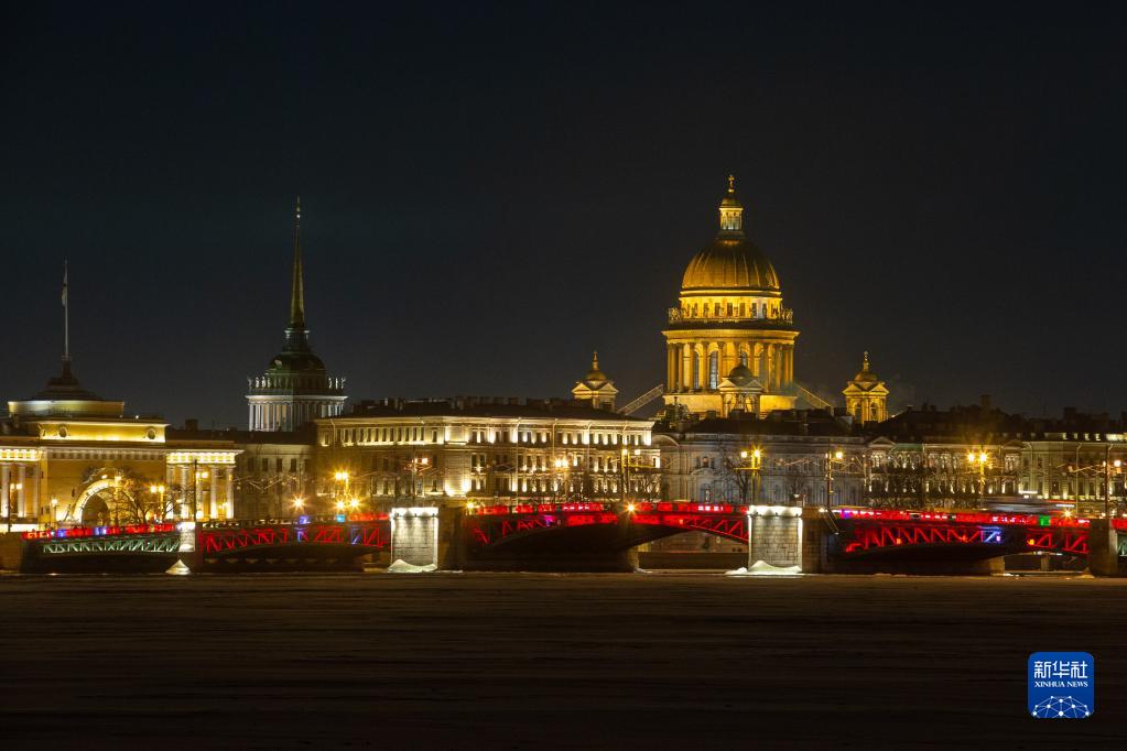 1月21日晚,俄羅斯圣彼得堡市中心涅瓦河上的地標性建筑冬宮橋亮起“中國紅”,迎接兔年春節的到來。