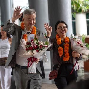 當天,旅游勝地巴厘島迎來2023年首架中國游客包機。乘客從中國深圳飛抵巴厘島后,在機場受到熱烈歡迎。