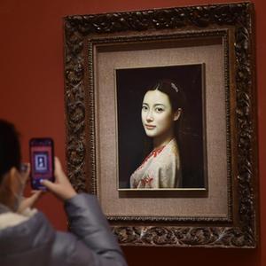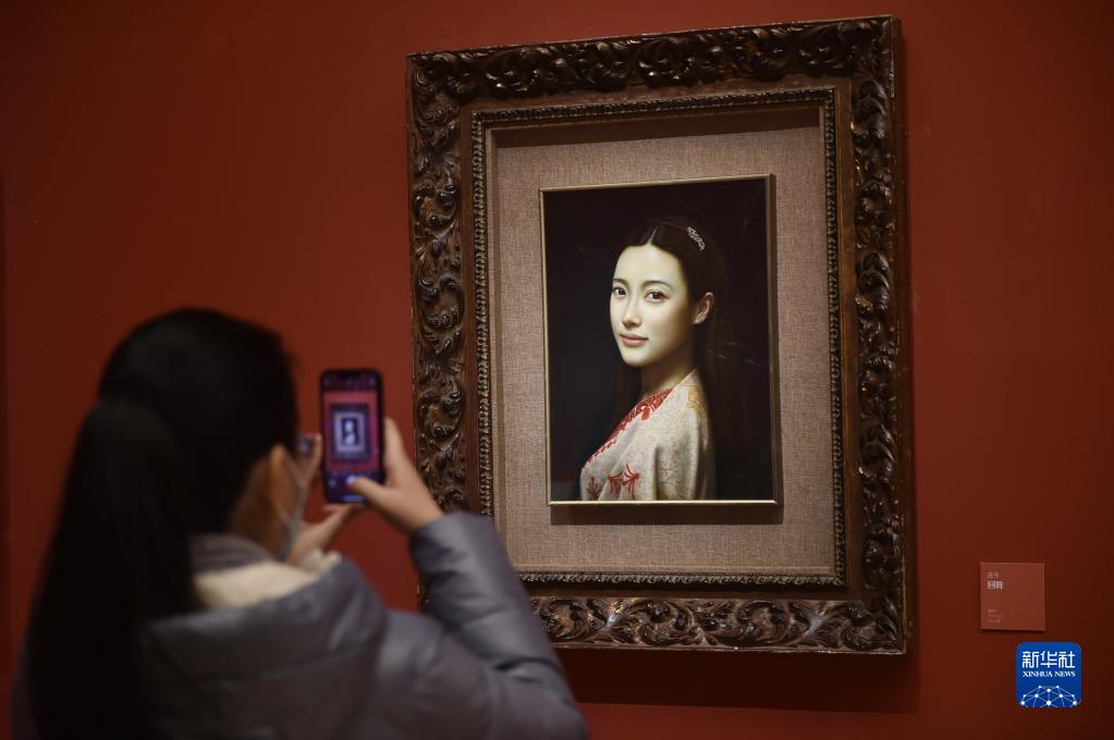 1月22日,參觀者在中國美術館拍攝“美在致廣——全國小幅美術精品展”中的展出作品《回眸》。