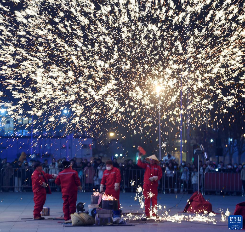 1月22日,在安徽省亳州市譙城區萬達廣場,民間藝人表演“打鐵花”。