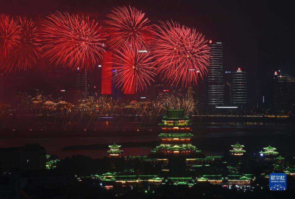 1月22日大年初一晚,2023年南昌市迎春煙花晚會在江西省南昌市贛江老官洲上演。絢爛繽紛的煙花在夜空中爭奇斗艷,為市民及游客送上新春祝福。
